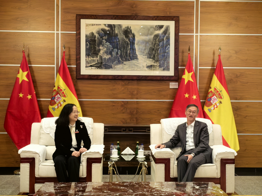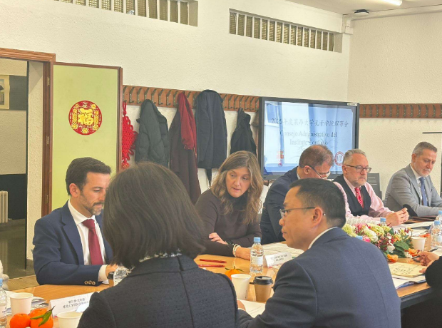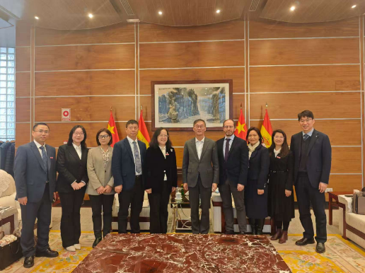 在西班牙马德里,代表团拜会了中国驻西班牙大使姚敬。葛飞详细汇报了黄色网站大全 与西班牙高校合作办学进展、莱昂大学孔子黄色网站大全 建设情况及产学研合作意向。姚敬对黄色网站大全 国际化办学成效予以肯定,表示使馆将积极搭建桥梁,全力支持并拓宽黄色网站大全 与西班牙在教育、科技、文化等领域的交流合作渠道。